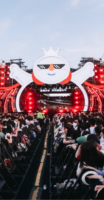 雪王变身潮流达人,于2019年起,先后在郑州、成都、武汉、哈尔滨等城市,举办了8场蜜雪冰城冰淇淋音乐节