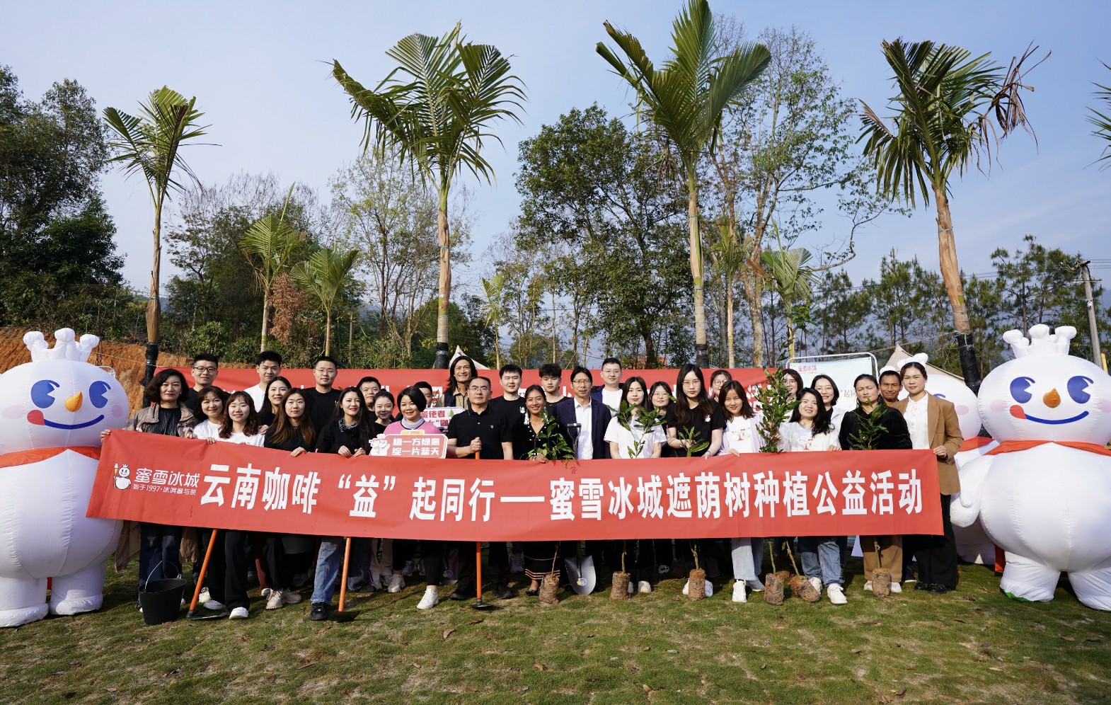 阳春三月,万物生长,希望萌动。3月12日植树节,蜜雪冰城在云南省普洱市孟连县正式启动“云南咖啡‘益’起同行——蜜雪冰城遮荫树种植”公益项目,并带领加盟商伙伴代表、员工伙伴代表一同在雪王公益1号地种下第一批遮荫树树苗。本次公益项目蜜雪冰城共计捐赠572832元,其中加盟商及员工伙伴也踊跃响应共捐赠71593元。该项目基金将全部用于YSCC云南精品咖啡社群对咖啡遮荫树的种植及在树木生长期内提供必要技术培训与支持。