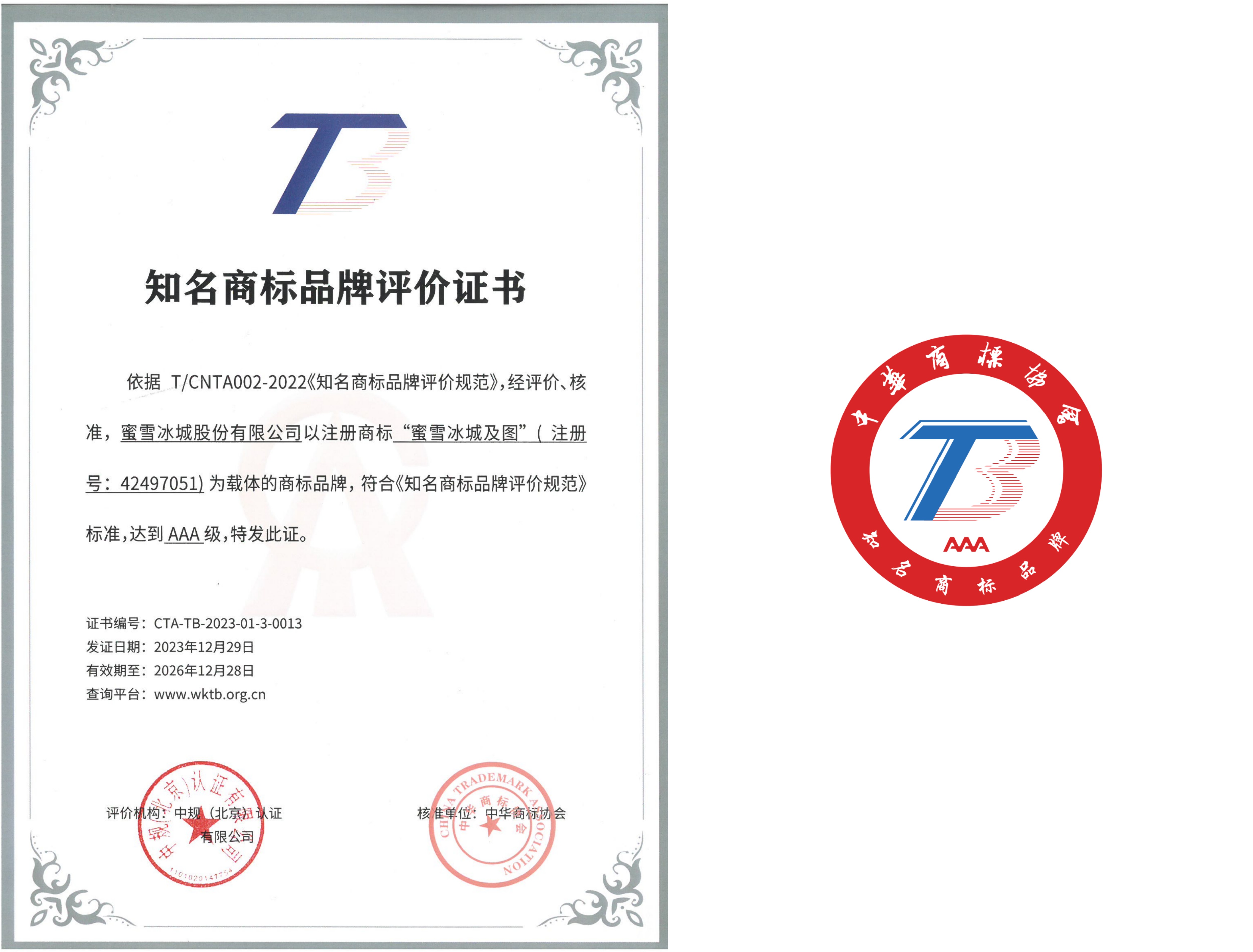 依据中华商标协会《知名商标品牌评价规范》T/CNTA002-2022 团体标准,第42497051号“ 蜜雪冰城及图”商标品牌经评价、审核符合标准要求,达到 AAA级。